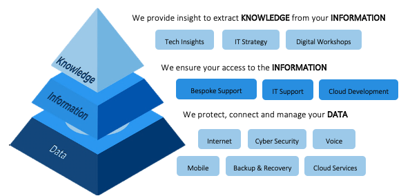 Hence, our story is of how our mindset developed along with the evolution of IT support services. To help our clients and ourselves with this concept, we have adopted the DIKW Pyramid throughout our website, minus the Wisdom part, we hope that the client has that bit.