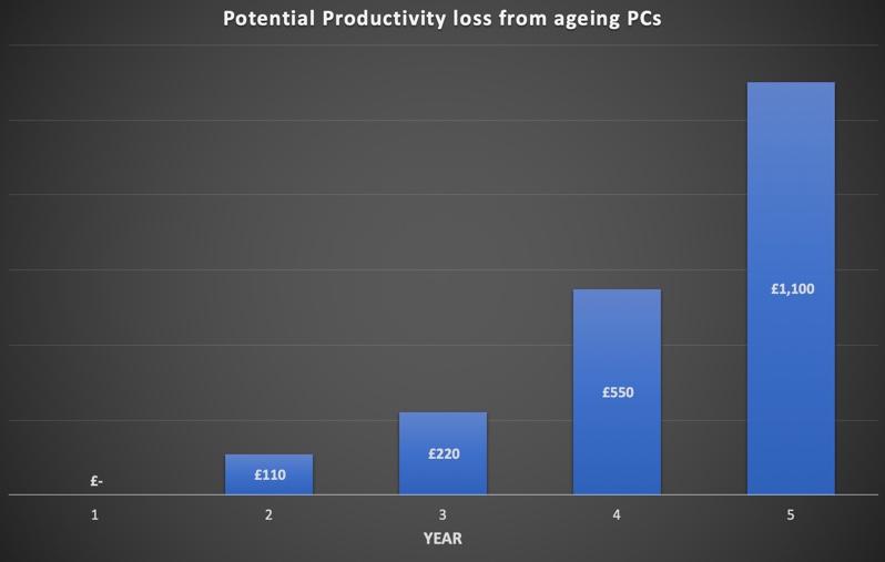 So let’s imagine a basic “business” grade computer that is now entering year four of its life. It now consumes 5 minutes of delays throughout the day compared to when it was new. That could be starting up in the morning, searching for emails, opening applications and security updates/scans. In year five, the delays have increased and now means the company is wasting employees time to the tune of £1,650. An average PC for a business with installation is easily around half of that.